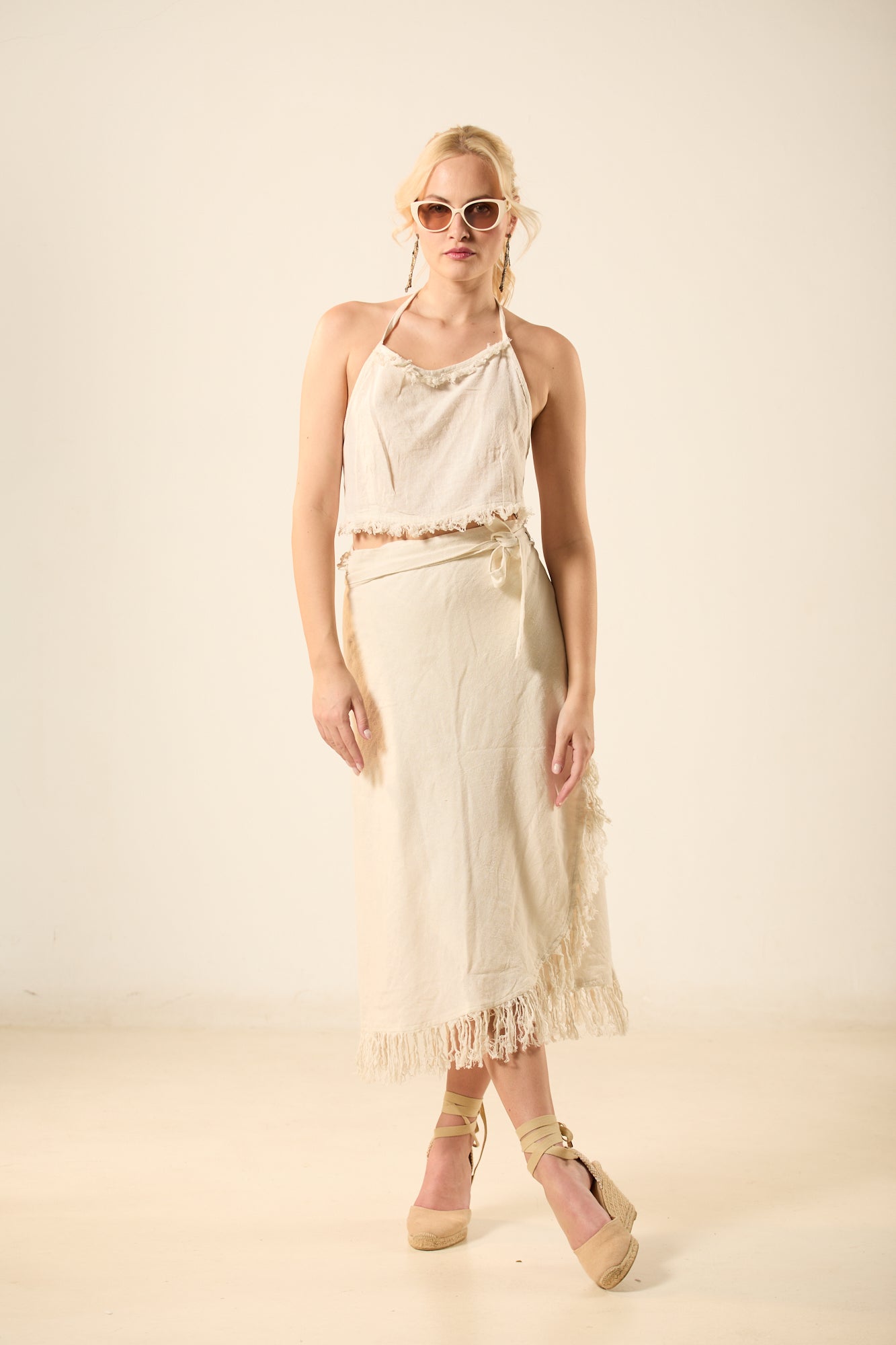 Σετ τοπ με φούστα από βαμβάκι με δέσιμο στο πλάι και λεπτομέρειες από κρόσια.