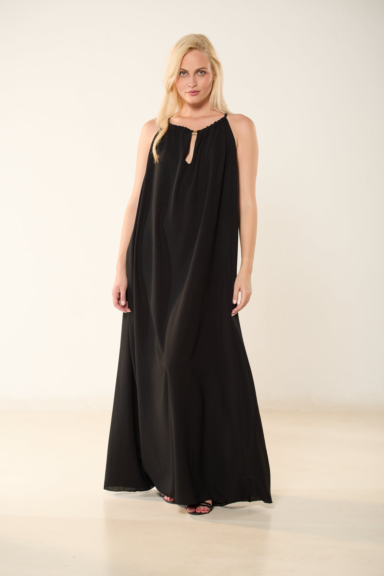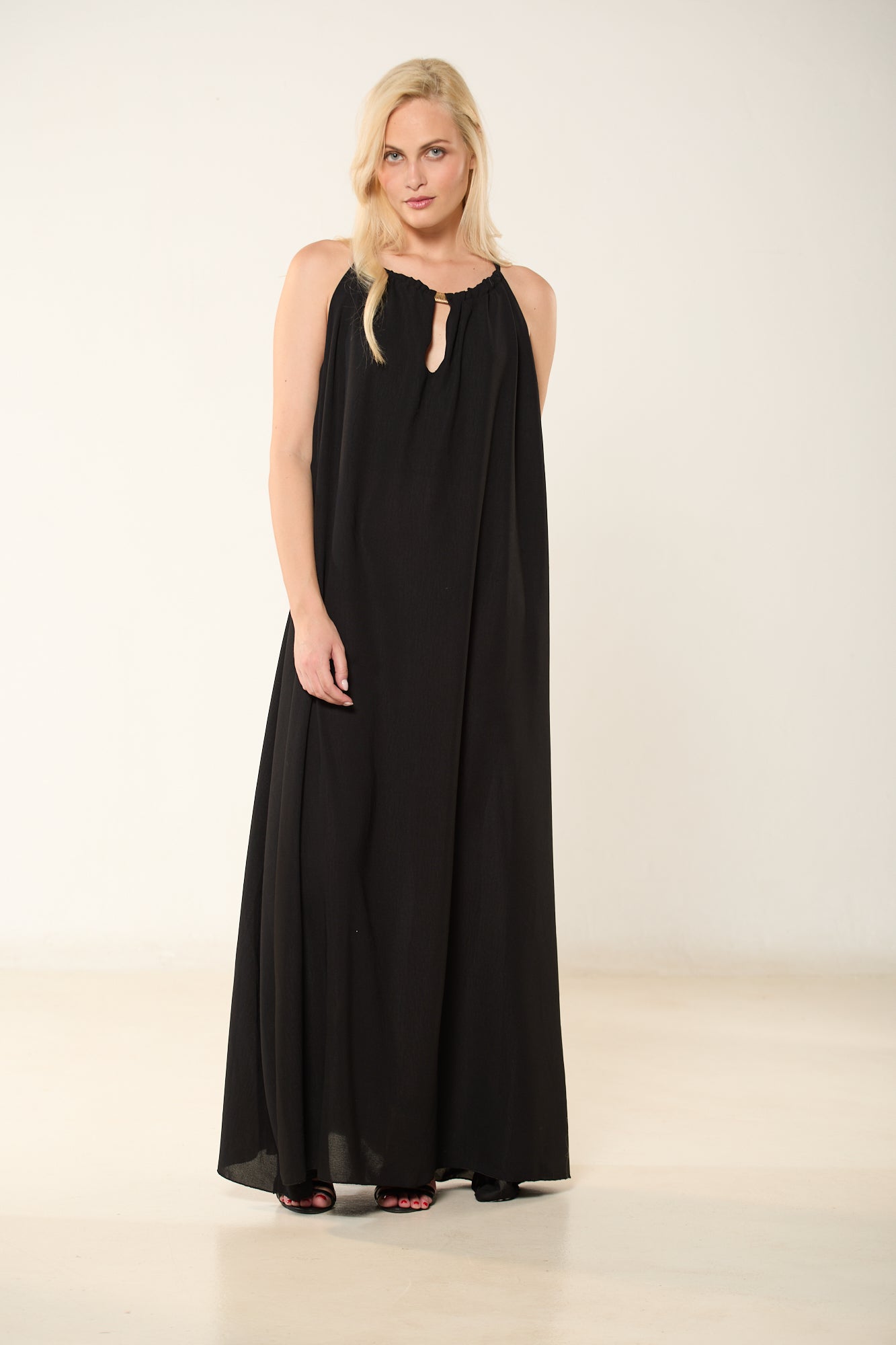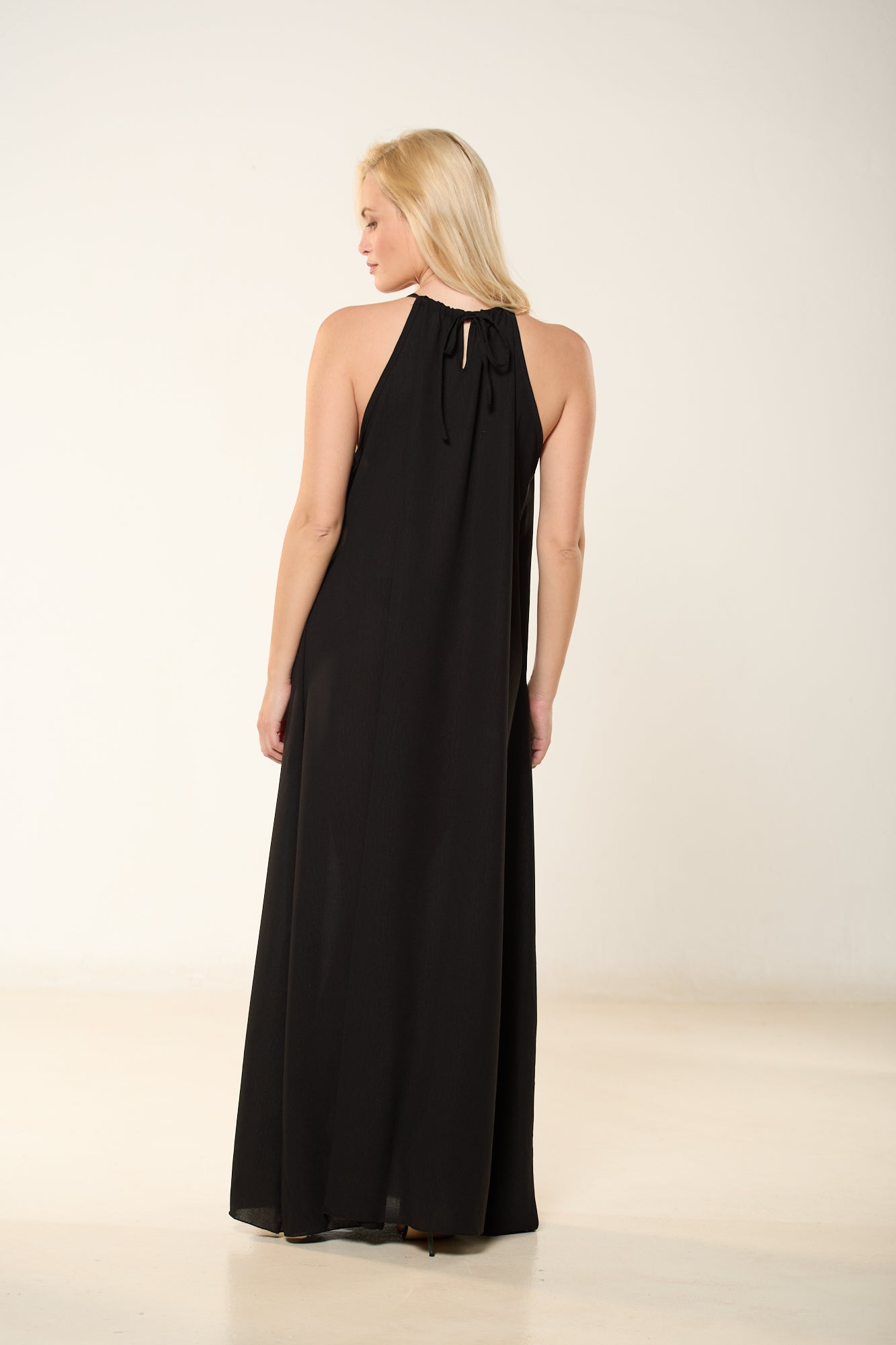 Φόρεμα μακρύ μαύρο με δέσιμο και λεπτομέρεια στον λαιμό. Σε άνετη, αέρινη γραμμή.