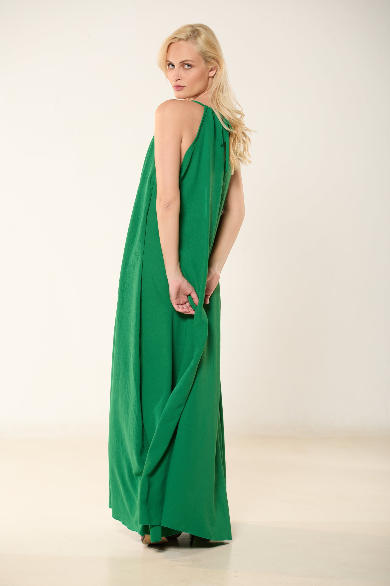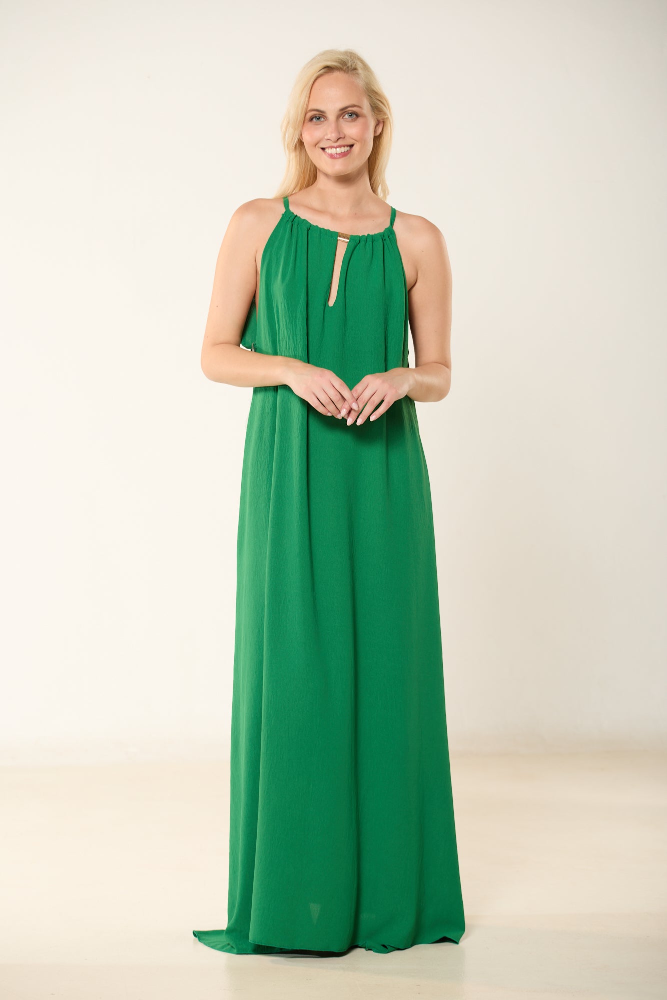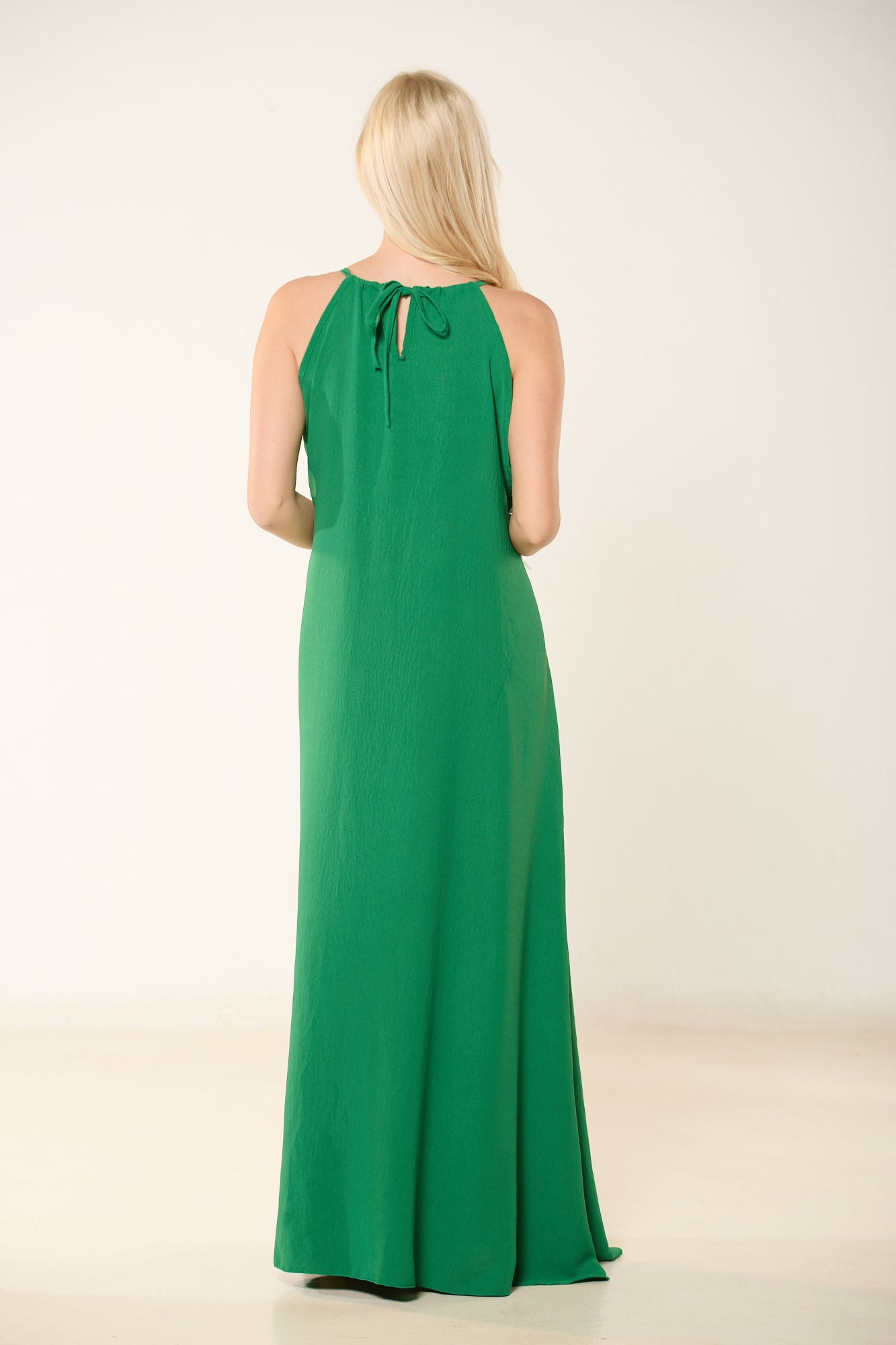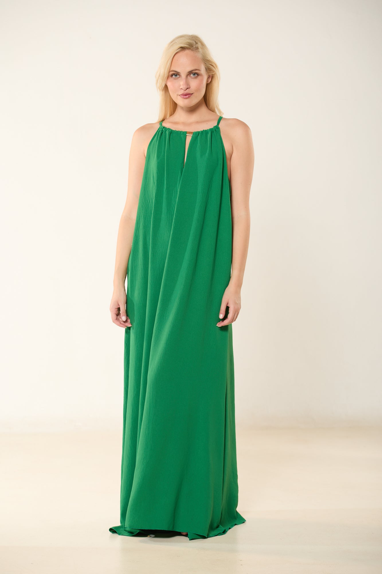 Φόρεμα μακρύ σε σμαραγδί χρώμα με δέσιμο και λεπτομέρεια στον λαιμό. Σε άνετη, αέρινη γραμμή.