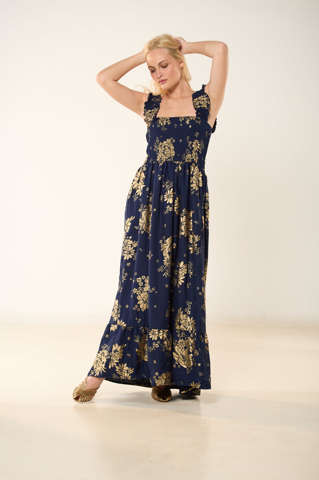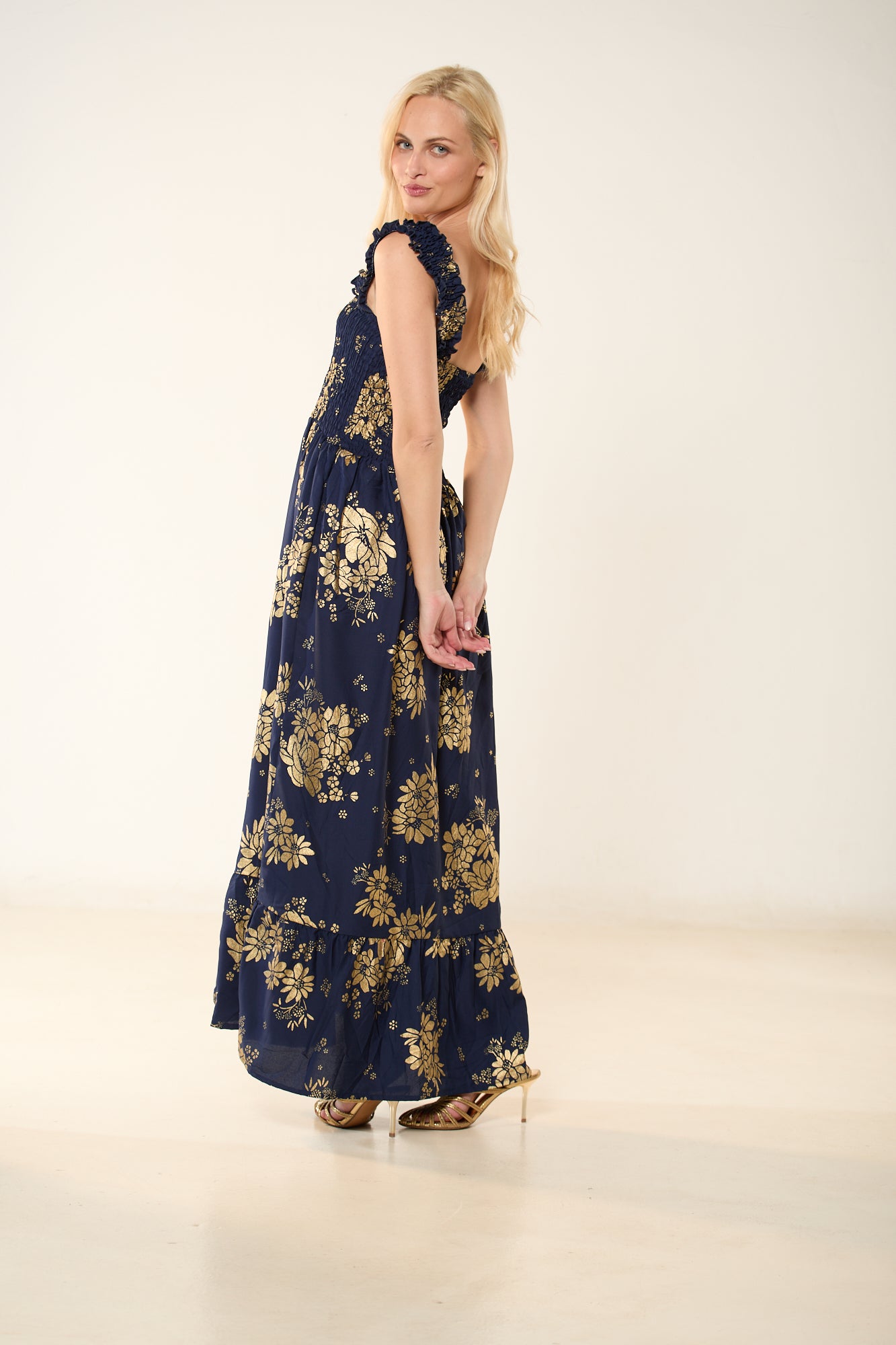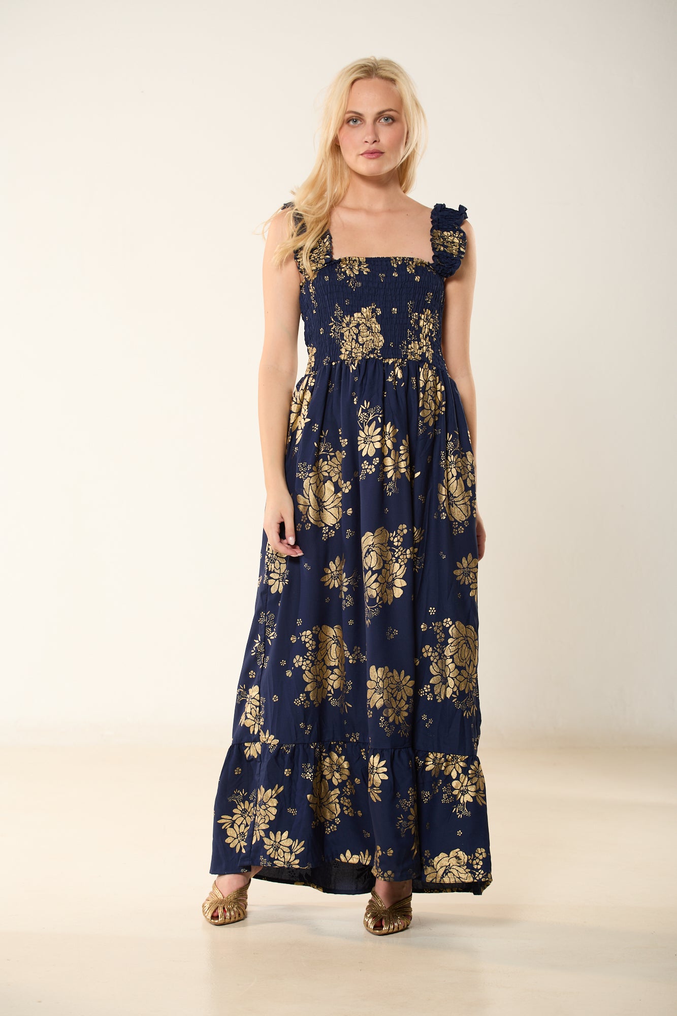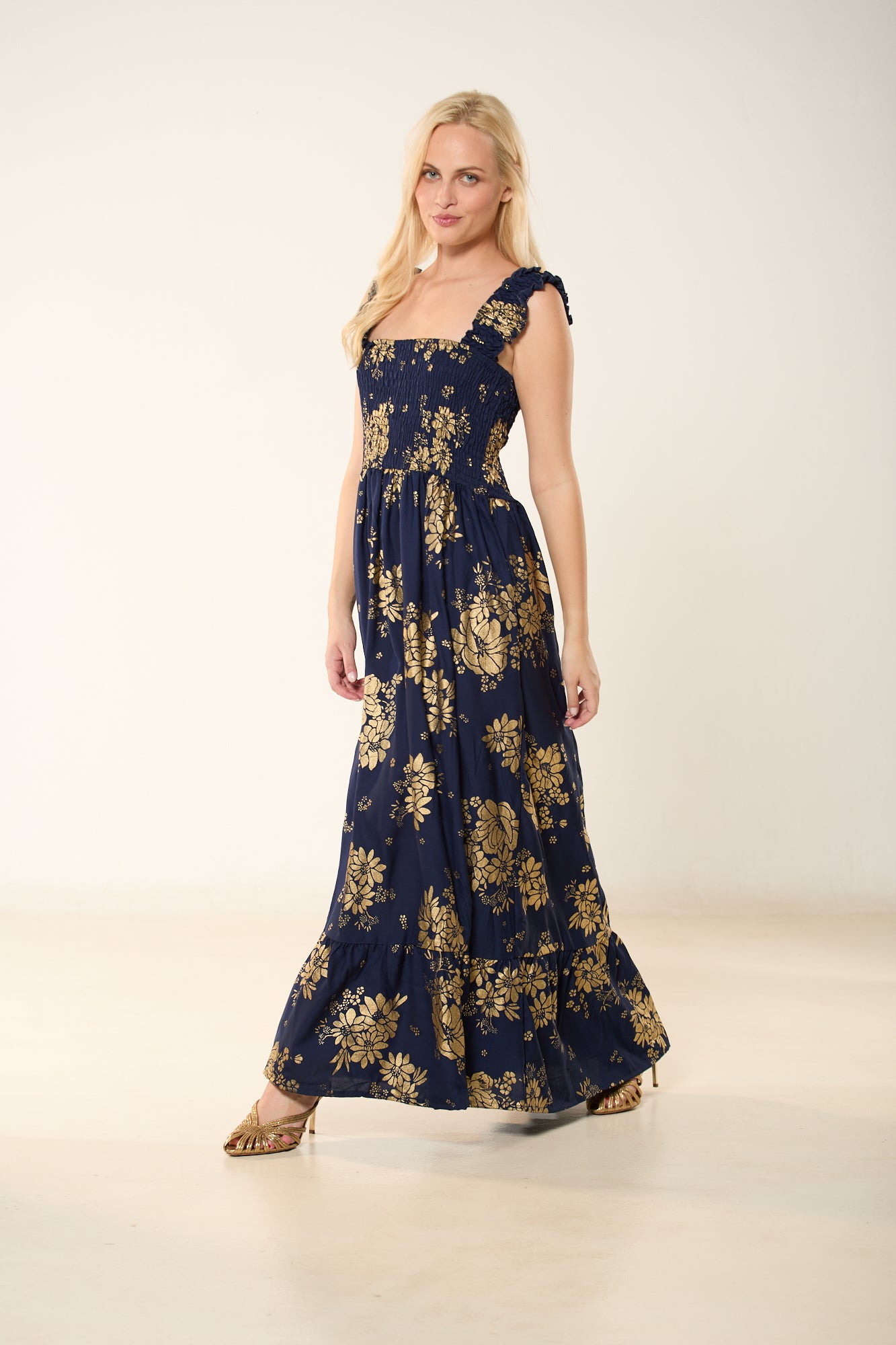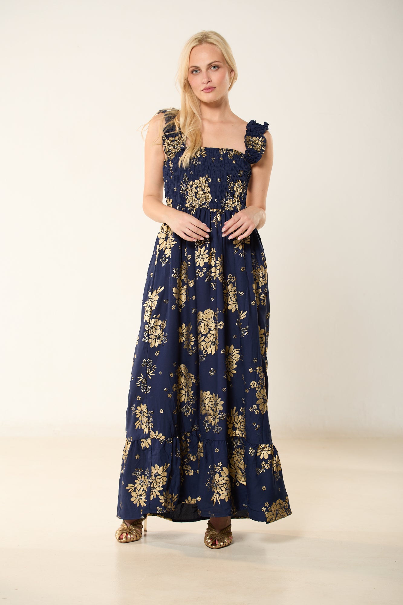 Αναδείξτε τη θηλυκή σας πλευρά με αυτό το αέρινο maxi φόρεμα σε βαθύ μπλέ χρώμα, διακοσμημένο με διακριτικά χρυσοκεντήματα σε μοτίβα λουλουδιών. Το ελαστικό σφηκοφωλιά μπούστο αγκαλιάζει το σώμα, προσφέροντας άνεση και κομψότητα, ενώ οι ρομαντικοί βολάν στους ώμους προσθέτουν μια ρομαντική πινελιά. Η φούστα καταλήγει σε φαρδύ βολάν, χαρίζοντας κίνηση και κομψότητα σε κάθε σας βήμα.
